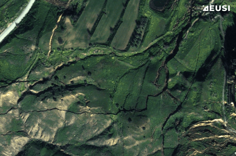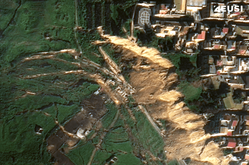 The analysis of satellite imagery goes beyond what we can see with our own eyes – EUSI images can be produced with up to 8 multispectral or 8 SWIR bands. We produced them as 4-band data and used the Near Infrared band to calculate NDVI, an index which, in this case, shows the impact of the landslide on vegetation and soil. An analysis like this can help with reconstruction and the prevention of further damage.